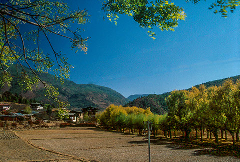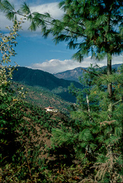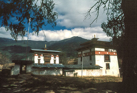 View of Trashi Chhoe Dzong from the hills above Thimphu