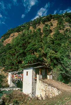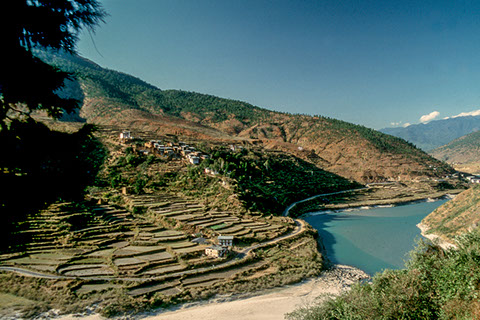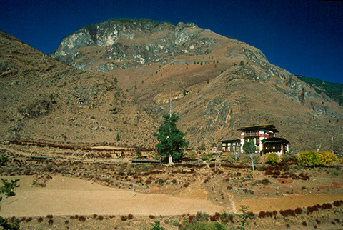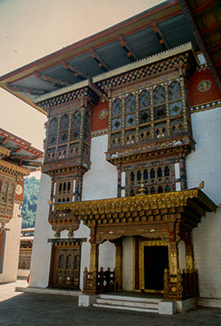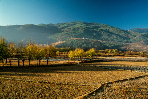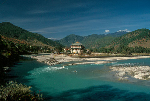 View of Trashi Chhoe Dzong from the hills above Thimphu